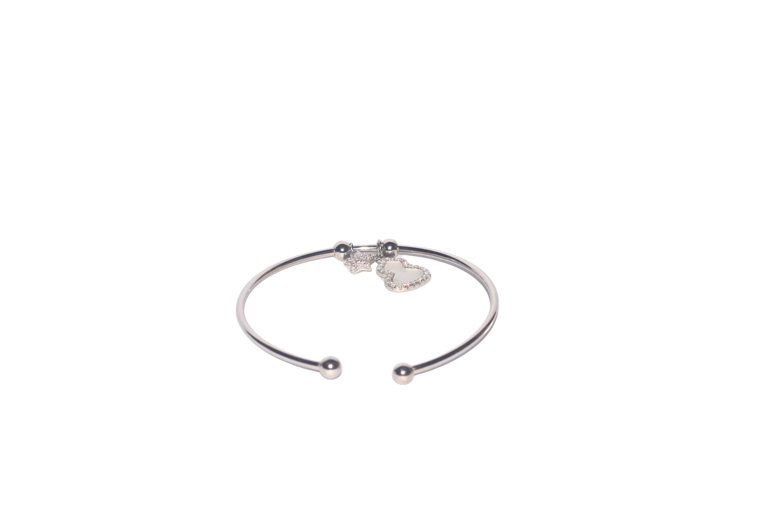 Add timeless elegance to your jewelry collection with this exquisite 925 sterling silver women’s bangle/kada. Designed with a sleek open cuff style, it features polished round ends for a modern, minimalistic appeal. At the center, delicate dangling charms including a star and a heart adorned with sparkling cubic zirconia stones enhance its feminine charm and sophistication.